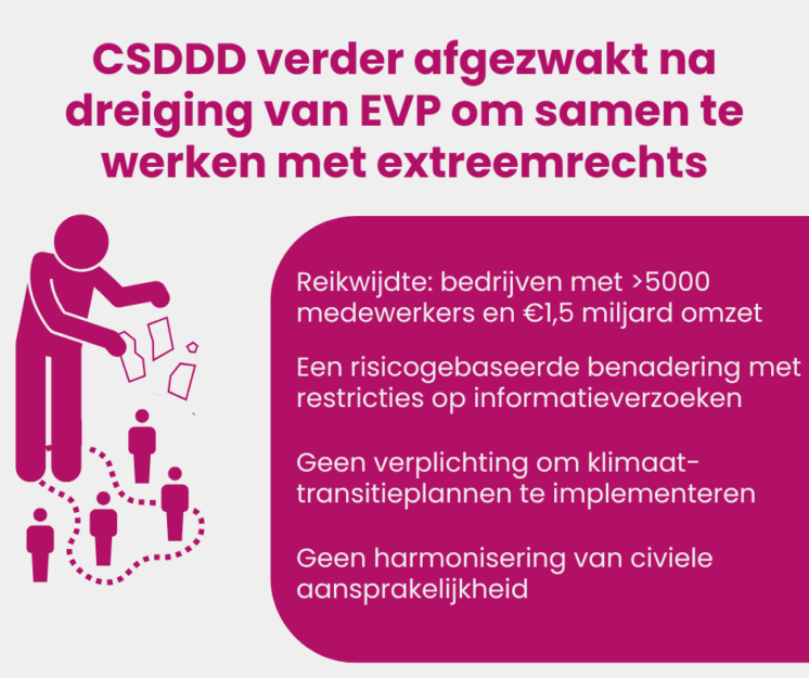 Vorige week heeft de hoofdonderhandelaar op dit dossier, Europees Parlementslid Jörgen Warborn (EVP), de centrumpartijen voor het blok gezet door twee voorstellen te presenteren waar deze partijen onmogelijk mee akkoord konden gaan. Na onderhandelingen met verwaarloosbare concessies van de EVP-fractie, kwam gisteren het akkoord van Warborn om met de centrumpartijen voor optie 2 te gaan. Europarlementariër Lara Wolters, initiatiefnemer van de CSDDD en hoofdonderhandelaar van de S&D, is opgestapt als schaduwrapporteur uit onvrede over het akkoord. Een moeilijke en bewonderenswaardige keuze voor iemand die zich al jaren voor de CSDDD heeft ingezet.